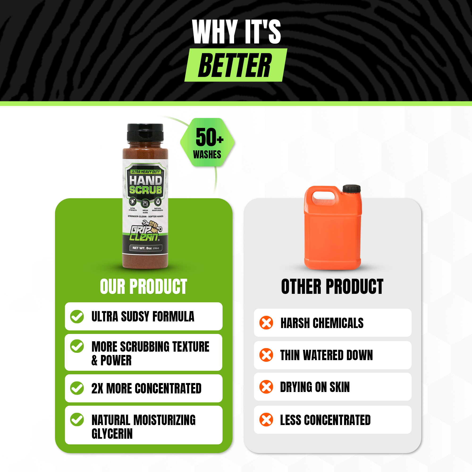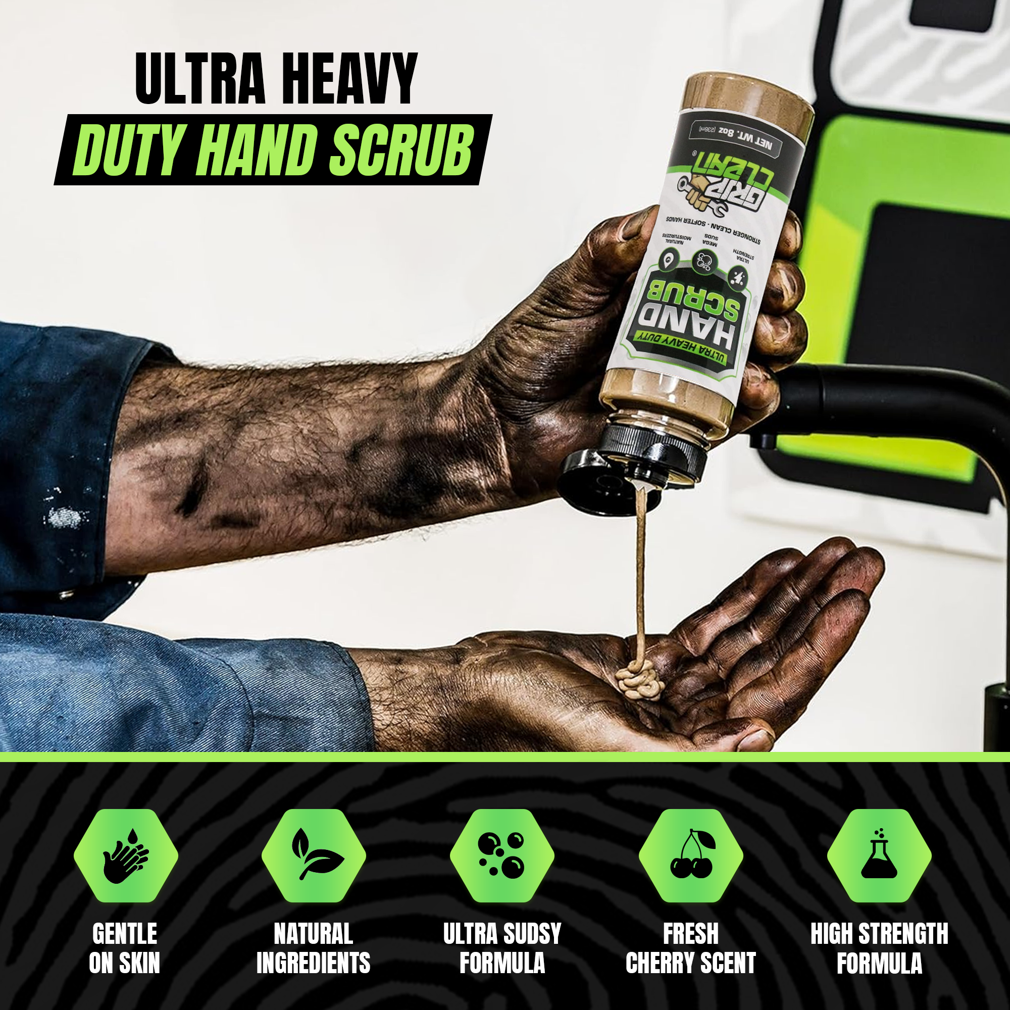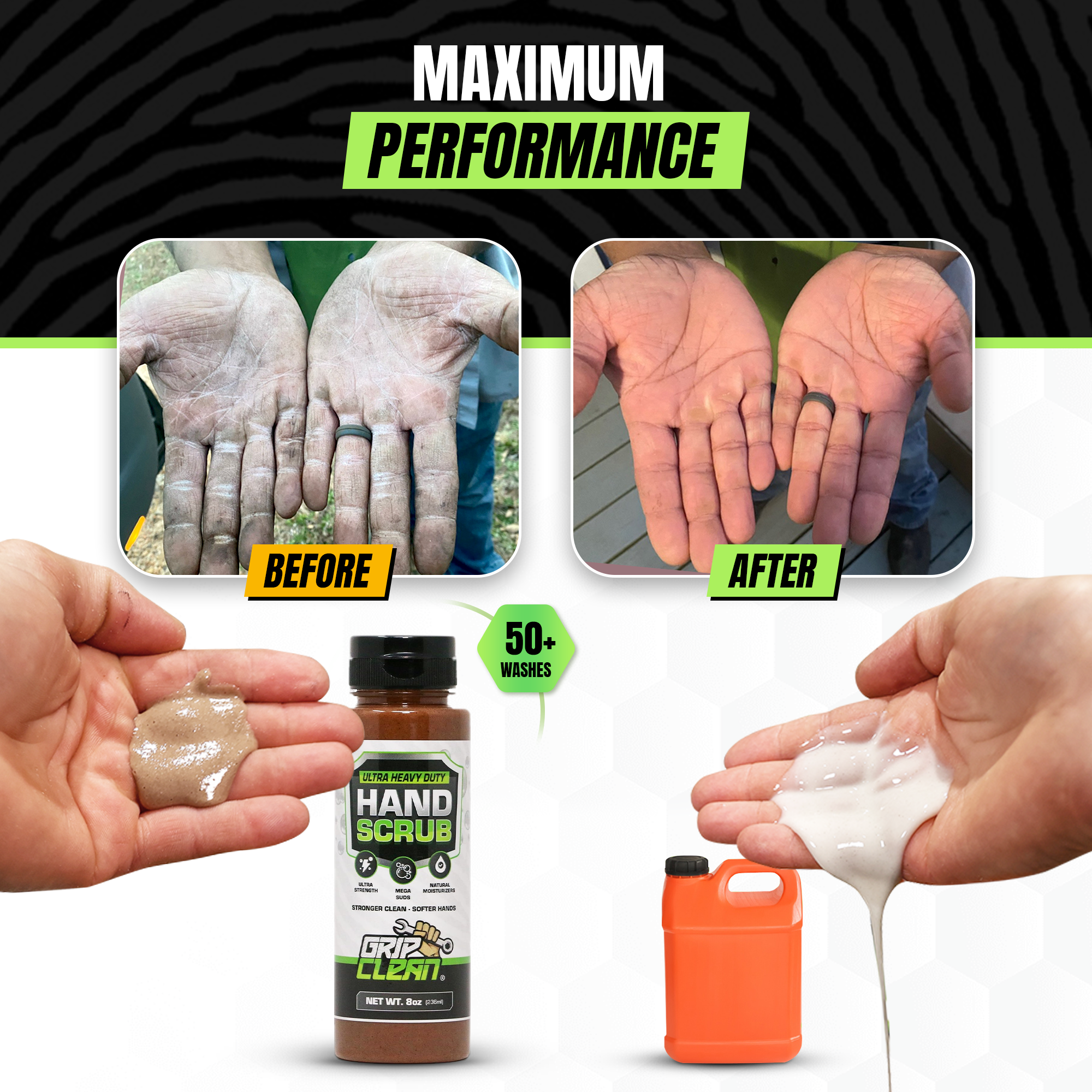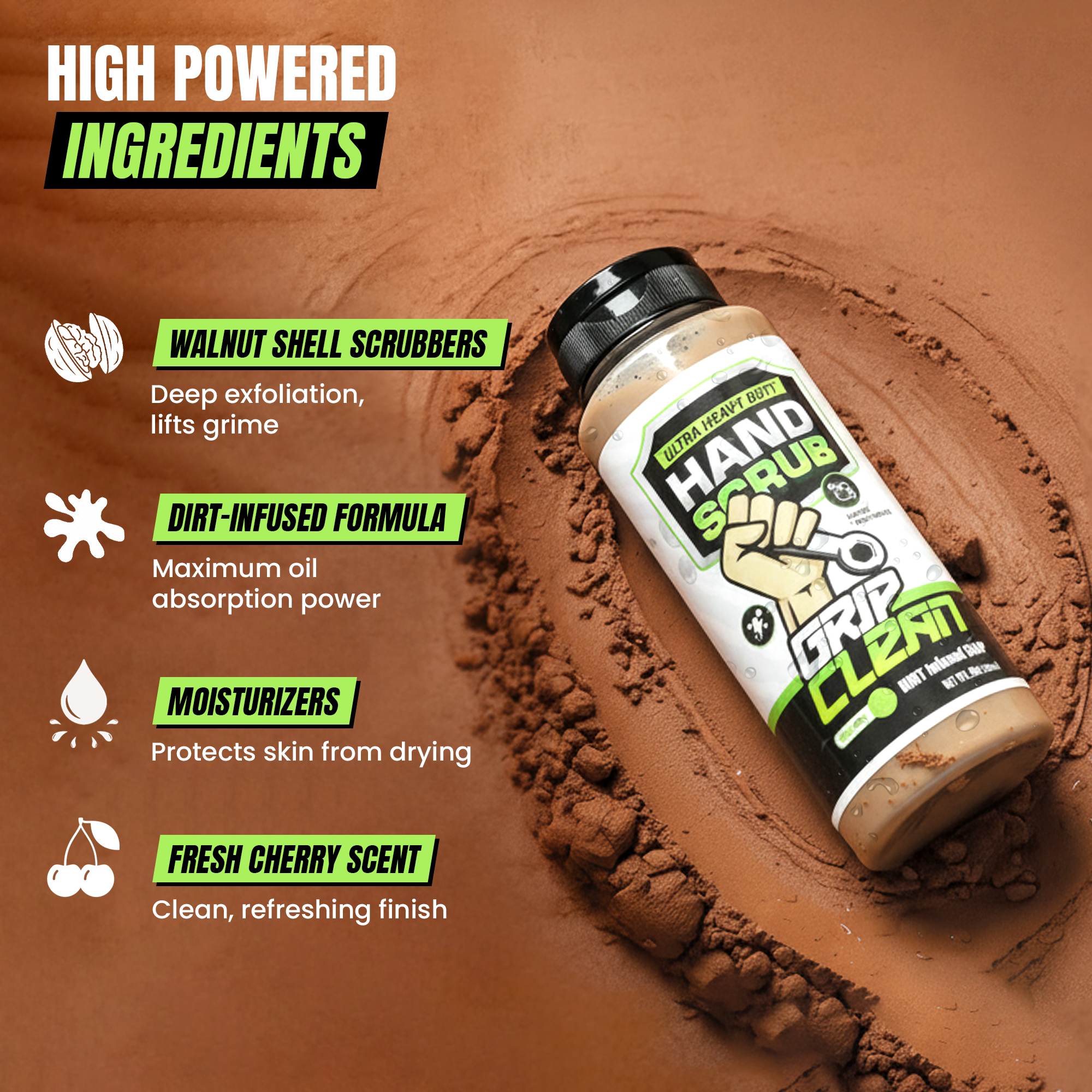 Grip Clean Ultra Heavy Duty Hand Scrub delivers pro-level cleaning with a 2X stronger formula that destroys grease, oil, and grime—without wrecking your skin. Powered by bentonite clay, walnut scrubbers, and coconut-based moisturizers, it lathers big, cleans deep, and leaves hands soft with a fresh scent of victory. Ditch the harsh industrial stuff—this is a clean that works.